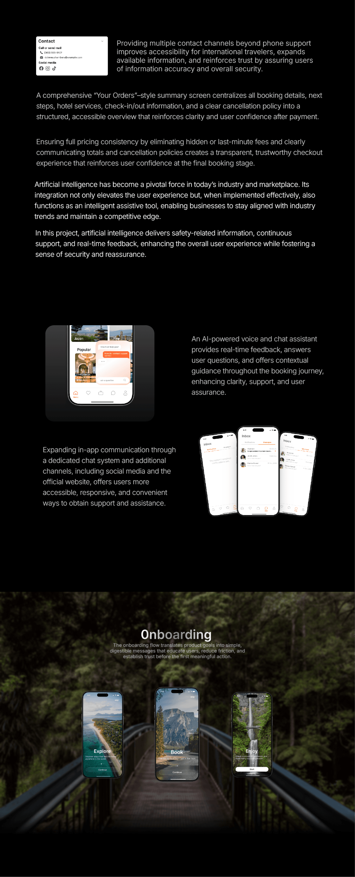 The onboarding flow translates product goals into simple, digestible messages that educate users, reduce friction, and establish trust before the first meaningful action.