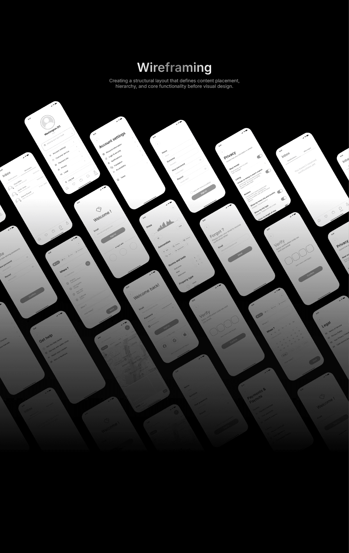 Creating a structural layout that defines content placement, hierarchy, and core functionality before visual design.