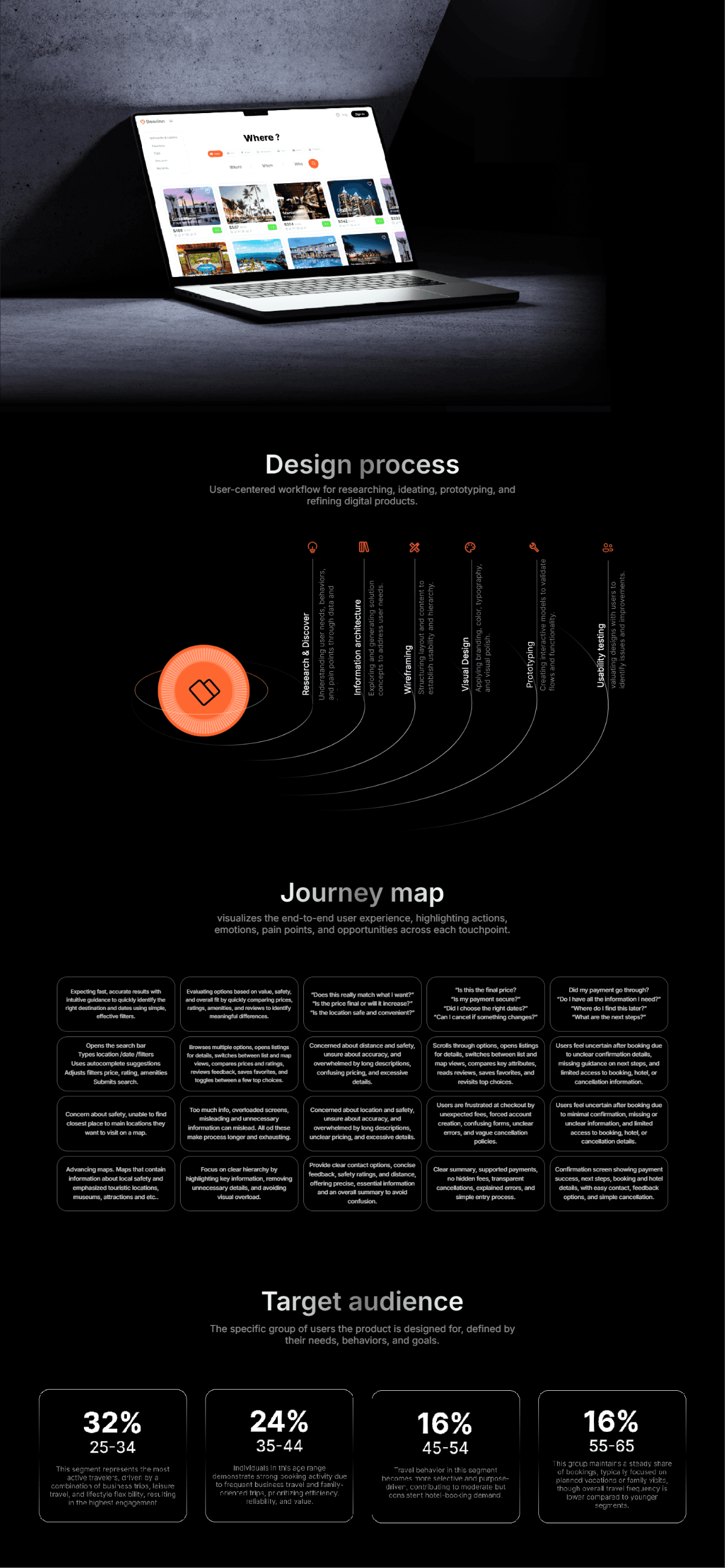 An empathy map visualizes what users say, think, do, and feel, helping the team understand emotional drivers and frustrations to design a clearer, more trustworthy booking experience.