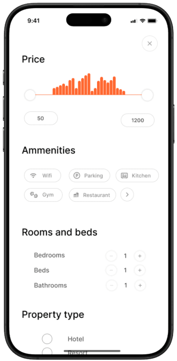 Adjusts filters price, rating, amenities